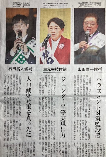福井県知事選の立候補者は、無所属で自民党支持山田賢一67歳、無所属石田嵩人(たかと)35歳、共産党金元幸枝67歳の3名で、いずれも新人である。