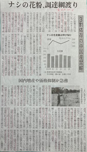 ――――――――――――――― ナシは同じ品種の花粉では実がつかず、生産する品種の樹木のめしべに別の品種の花粉をつける必要がある。 二十世紀梨なら幸水などの花粉を春に農家が授粉して夏〜秋に実をつける。 花粉の国内生産は7割で3割は輸入だった。 輸入のほぼ全量を依存していた中国で、2023年にバラ科植物に被害をもたらす「火傷病」がまん延したため、日本政府は中国産花粉の輸入を禁じた。 ―――――――――――――――