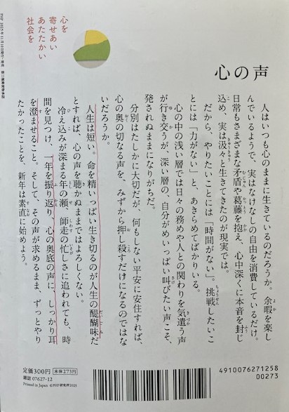 月刊誌『PHP』は、小さな版型でページ数も少ない。 内容は易しく分かりやすく温かさに満ちている。 手軽で税込300円だから財布にやさしい。 買ってから年数が経っても、読めば新鮮で心に語りかけてくる。 見た目と違って内容が濃いから色あせることがないのだ。 今回は前回に引き続き、裏表紙のコラム最新号(2025年12月号)のものを紹介したい。